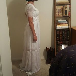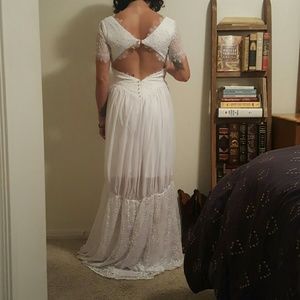 This beautiful wedding gown was a bit too small for me in the sleeves so it has never been worn. It is well constructed and the attention to detail in the beading and lace work is fantastic