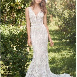 You can't go wrong with this boho fit and flare wedding dress—and the allover geometric lace is flattering on all body types! This dress was purchased as final sale, so is brand new and never been worn with tags still on.