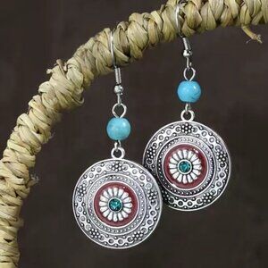 Boho Chic Western Aztec Pierced Dangle Earrings Turquoise Silver Red