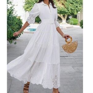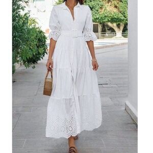 Boho White Button Down Eyelet Puff Sleeve Ruffle Hem Maxi Dress
