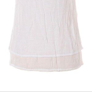 Embrace effortless boho style with this boutique sleeveless blouse in white with beautiful blue embroidered floral circle accents. Made from a lightweight, breathable 50% silk / 50% cotton blend, it features a soft crinkled texture, layered hem, and scoop neckline. Machine washable for easy care. Size S. In excellent pre-owned condition with no visible flaws.