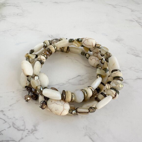 Add rustic boho style to any outfit with this handmade white stone memory wire bracelet. Features creamy howlite, sparkling crystals, and metallic beads for an earthy, natural look.