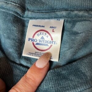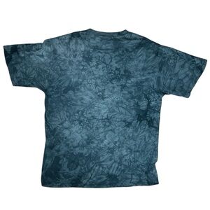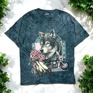 Delta Pro Weight T-shirt featuring a striking wolf graphic paired with roses, feathers, and a classic motorcycle. This unique design is printed on a deep blue tie-dye/stonewash effect background, perfect for fans of biker style, animal prints, or Native American-inspired art!
