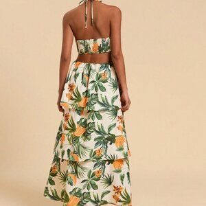 Boho Women's Tropical Plant Print Halter Waist Cutout Maxi Dress