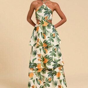 Boho Women's Tropical Plant Print Halter Waist Cutout Maxi Dress