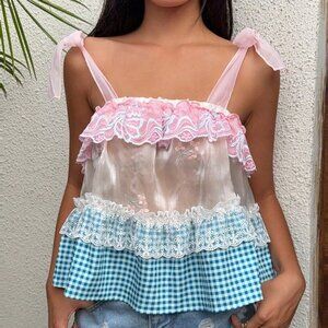 Boho Women's Vacation Plaid multi print Lace Splicing Camisole top