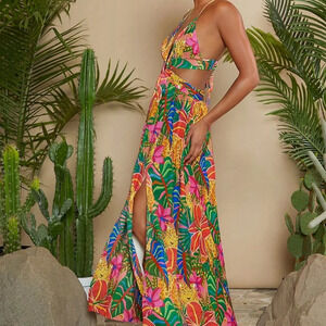 Boho Women's chic Tropical Print Crisscross Tie Backless Split thigh Dress