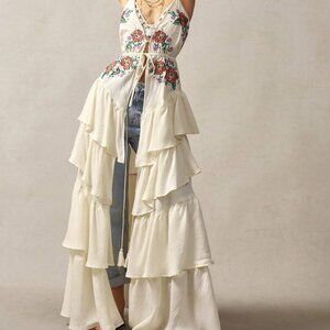 Boho Women's floral Embroidery Pattern Ruffle Trim Backless maxi cami top