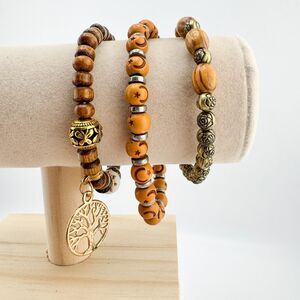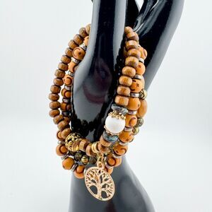 Boho Wood Bead Stretch Bracelet Set Tree of Life Charm Rustic Earthy Stackable