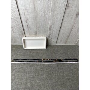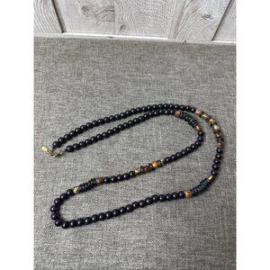 This necklace features a beautiful blend of dark wood beads and unique brass accents, offering a distinctive accessory option for fashion-forward individuals.