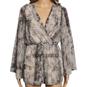 Boho Wrap Romper Long Sleeve V Neck Bell Sleeve Abstract Print Neutral Size S