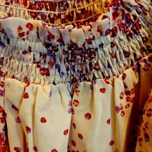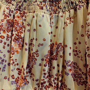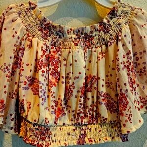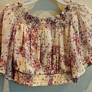 Floral Resort set of crop top and maxi skirt. The brand is Minkpink. The elastic in skirt makes it comfortable. The sleeves are flutter style and can be worn on or off shoulder. Chanel your inner goddess with this boho look. This is a 2 piece set