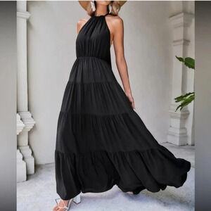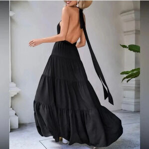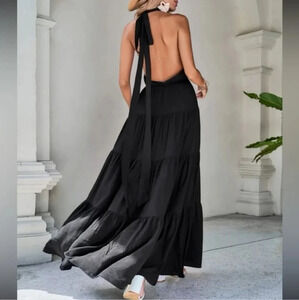 Boho black open back ruffle hem halter maxi dress