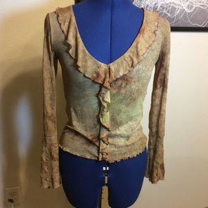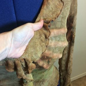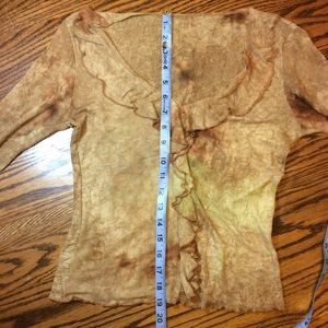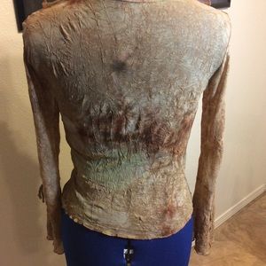 Super sheer and stretchy, 3/4 sleeve with slit bell sleeve ends. Wrinkly look fabric. Colors are tan, gold, dark orange.