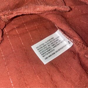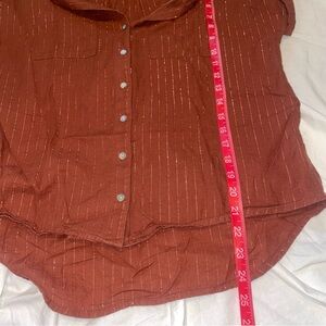 This A New Day rust color button-down blouse in size M is a stylish and versatile addition to any woman's wardrobe. The high-low hem and short sleeves make it perfect for casual occasions during the summer, fall, and spring seasons. Made from a comfortable cotton blend material, this blouse is easy to care for with machine washable instructions. The basic style and regular fit make it a timeless piece that can be worn effortlessly.