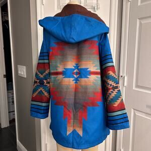 Gorgeous Southwestern-style hooded coat featuring a bold multicolor Aztec print.