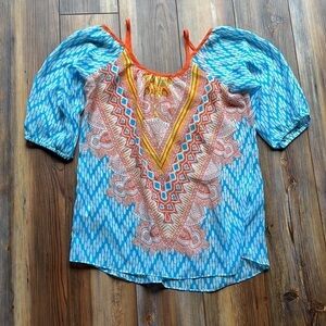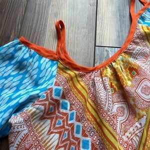 Shear, super cute and flowy with bright orange straps and sky blue and sunshine vibes!