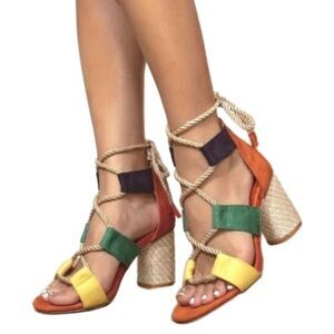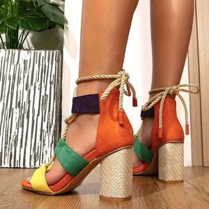 Women's Colorblock Heeled Sandals, Open Toe Cross Strappy Chunky Heels, Fashion Lace Up High Heels