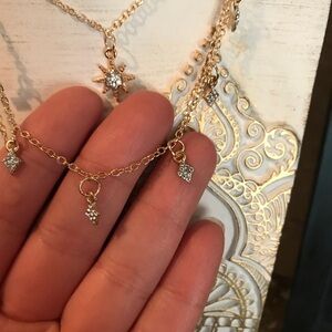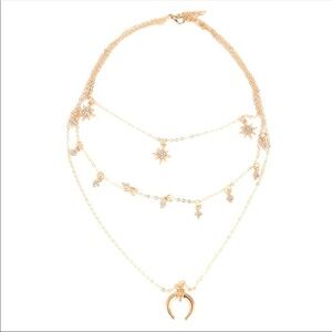 Bohemian multi layered attached crescent moon and stars charm choker necklace. Gold tones.