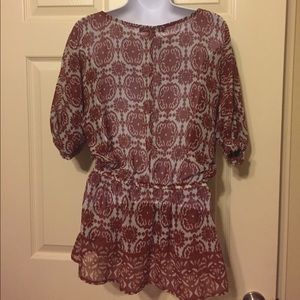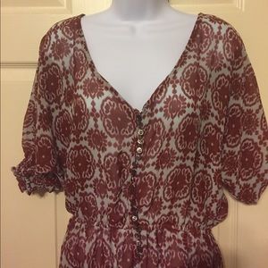 Bohemian style blouse, with black pearl buttons, elastic dropped waste, elastic ruffle sleeves. Super cute for festivals, somewhat see through. Hand wash cold, line dry