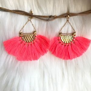 Boho fan-shaped tassel fringe statement earrings, bright pink and gold, NWT!