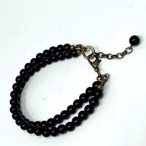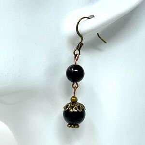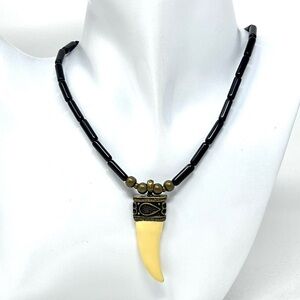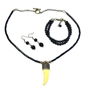 Fun boho necklace showcases a faux tiger (or lion) claw with obsidian tube beads. Finished with a bronze chain and toggle clasp. The set includes a double strand jasper bracelet & earrings, all finished in bronze color metal. Length of necklace is 20.5”; bracelet 7.5” + a 1” extender; earrings 1.75” from the top of the earring hook. Customization available upon request.