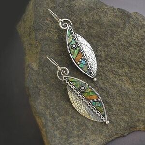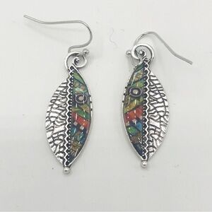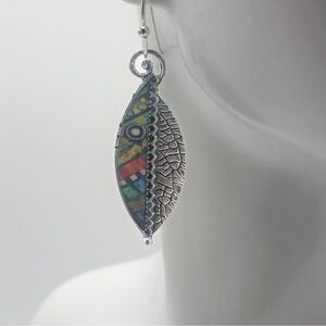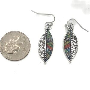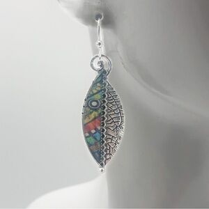 These whimsical earrings are part leaf and part fish. Multi colored with touches of blue, green, and brown.
