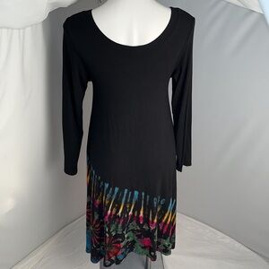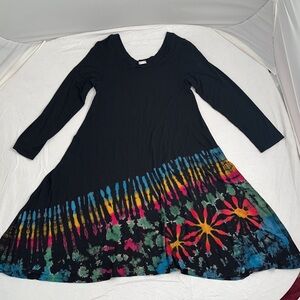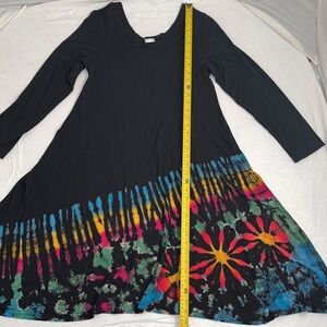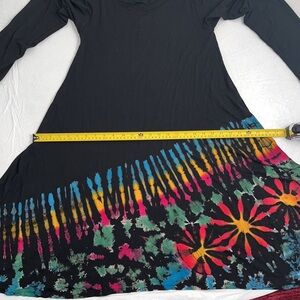 Boho half tie-dye tunic dress in black rainbow. S/M - fits 4-8. Long sleeves. Hand tie-dyed with rich colors. Scoop neck. Lots of stretch. It’s oversized- see measurements in photos. My husband always buys me stuff like this in cute little boutiques in adorable little walkable towns, then I never wear them. This is super cute & I LOVE tie dye but I don’t even wear dresses anymore. Excellent condition, smoke free home