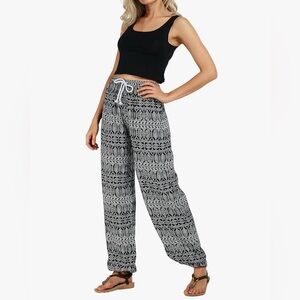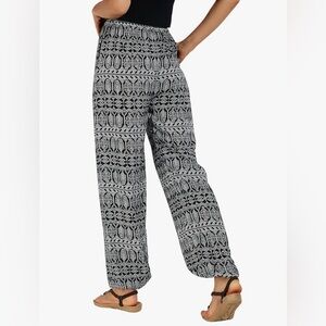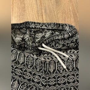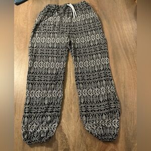 Black and white patterned elastic waist pull on pants has tie drawstring waist. Elastic to ankles, size medium. in excellent condition,