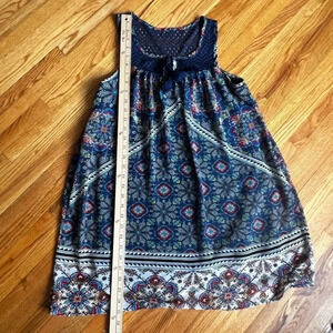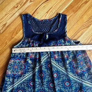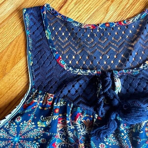 Boho lightweight top, size medium. In excellent used condition, no rips tears or stain. Multi colored pattern with blue lace on the top.