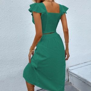 Boho mint Green V Neck Twist Ruffle Crop Top Skirt Set