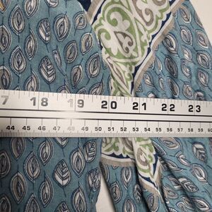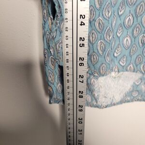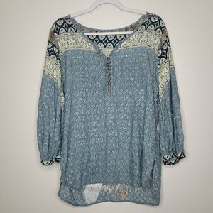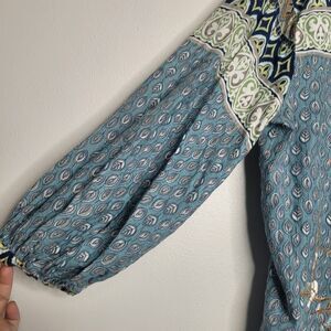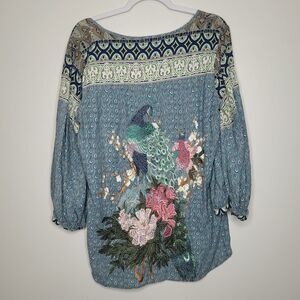 Boho peacock embroidered balloon sleeve blue mixed print art to wear top size L