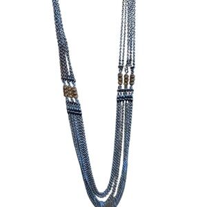 This multi-layered necklace features a blend of dark tone silver metal . and brown tone wood , perfect for adding a touch of boho western to any outfit.