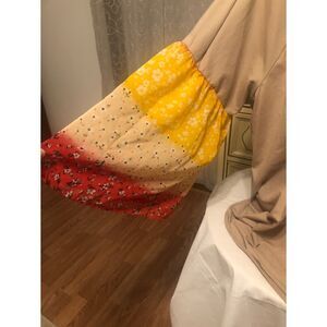 This top has a solid tan body with a knotted detail at the front hem. The wide flowing sleeves are a vibrant floral design in colors of red, yellow, and tan. Top is very stretchy and comfortable - perfect for everyday wear or on those relaxed occasions.
