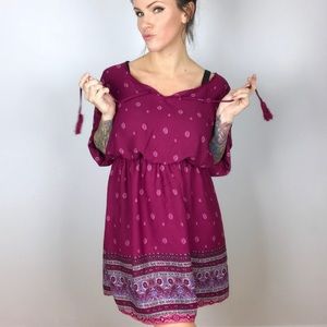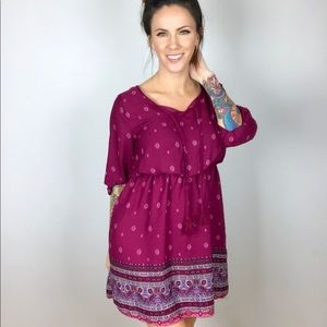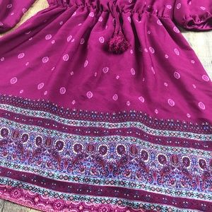 Comfy easy to wear, wrinkle resistant fabric with fun tassel neck tie. Elastic cinched waist. Could fit multiple sizes. Itโs actually too big for me.