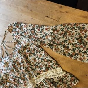 Super cute top with bell sleeves and strappy back details. Great floral fall colors. Would look cute with flared jeans and brown wedges!
