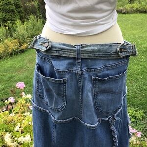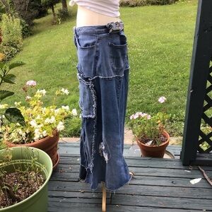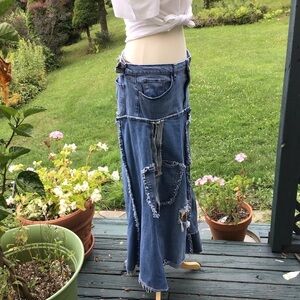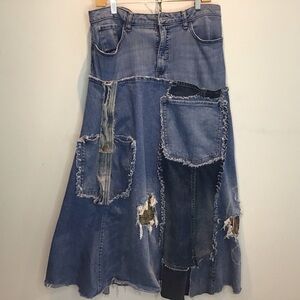 Boho up-cycled denim patch distressed jean maxi skirt / Lee 16 adjustabl…