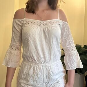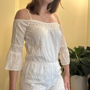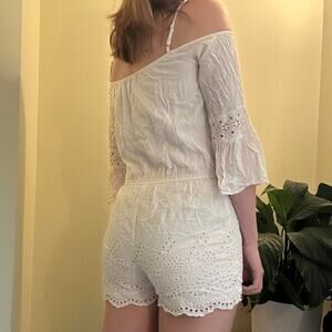 eyelet romper, boho chic, feminine, flowy, sunset colors, lightweight, lace details, festival fashion, casual summer, romantic
