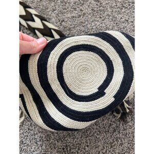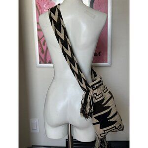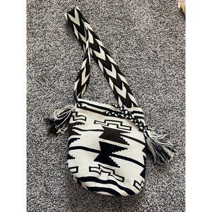 This handwoven crossbody bag combines cultural artistry with functionality. Featuring black and white geometric patterns, it offers ample interior space for essentials. The long strap ensures comfortable wear, while the tassel accents add a stylish touch to the design. A versatile addition to any wardrobe.