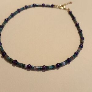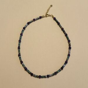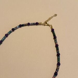 This elegant beaded necklace features a stunning combination of purple and blue beads. Perfect for adding a touch of color to any outfit.