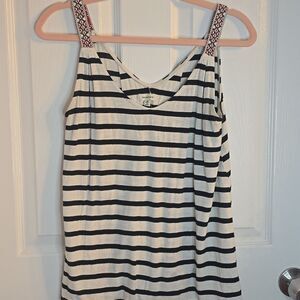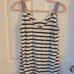Stylish tank top with classic black and white stripes. Features unique patterned straps. Perfect for casual wear.