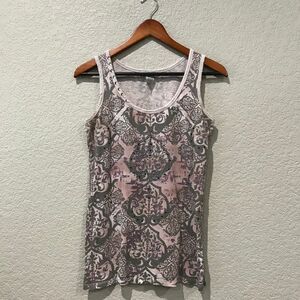 Women's size small light pink and gray patterned, rhinestone embellished tank top with "laced" rope detail along right side of neckline. 100% cotton. Gently worn and in great condition!