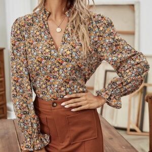Boho Blue Pink Floral Ruffle Puff Sleeve Top