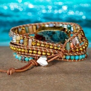 Boho chic bracelet, leather wrap bracelet, Chrysocolla Jasper, natural stone bracelet, multi-stone beads, turquoise jewelry, gemstone bracelet, adjustable bracelet, handmade jewelry, artisanal jewelry, bohemian style bracelet, boho wrap bracelet, stacking bracelets, layering bracelet, unique gift for her, festival jewelry, beach bracelet, statement bracelet, turquoise beads, leather jewelry, bohemian fashion accessories, gemstone jewelry, earthy jewelry, trendy boho jewelry, casual chic, vacay