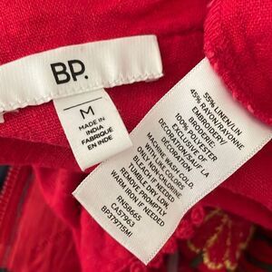 BP. Linen Blend Red Embroidered Floral Cropped Tank Top sz M. Features a lipstick red fluid fabric (55% linen, 45% rayon), 11 hook and eye front closures, embroidered colorful floral daisies in shades of yellow, green, cobalt blue, turquoise and hot pink, dot lace trim across top and straps, fixed straps. Gently worn and laundered with light wash wear but no flaws to note. This has a bit of a nubby texture to it, which is characteristic of linen. Such a perfect piece to compliment so many looks and styles - Barbiecore, Boho, Cottagecore - would look great with some high waist wide leg jeans and wedge sandals!