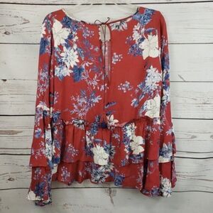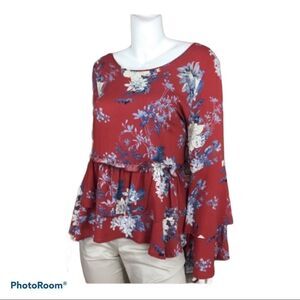 Boho style top, featuring a lovely red with floral print. Tassel tie at top back. Gorgeous ruffle flare sleeves!