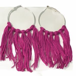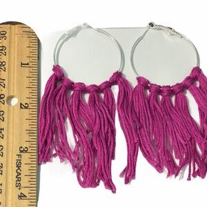 Boho Fringe Tassel Hoop Earrings Silver Tone Magenta Purple Big Statement Large