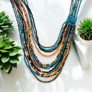 Add a bold splash of color and texture to any outfit with this handcrafted boho-inspired seed bead necklace. Featuring vibrant strands of teal, orange, black, and multicolor beads, this layered design creates a stunning draped silhouette that’s both earthy and eye-catching. The intricately woven sections at the top give it an artisanal touch, perfect for lovers of unique, global style.