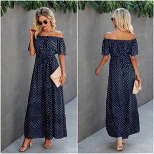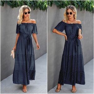 Boho Navy Blue polka dot off shoulder ruffle dress