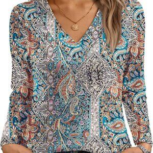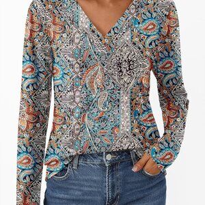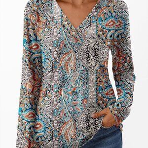 Boho-Print Long Sleeve Women's V-Neck Top - Soft, Comfortable & Versatile